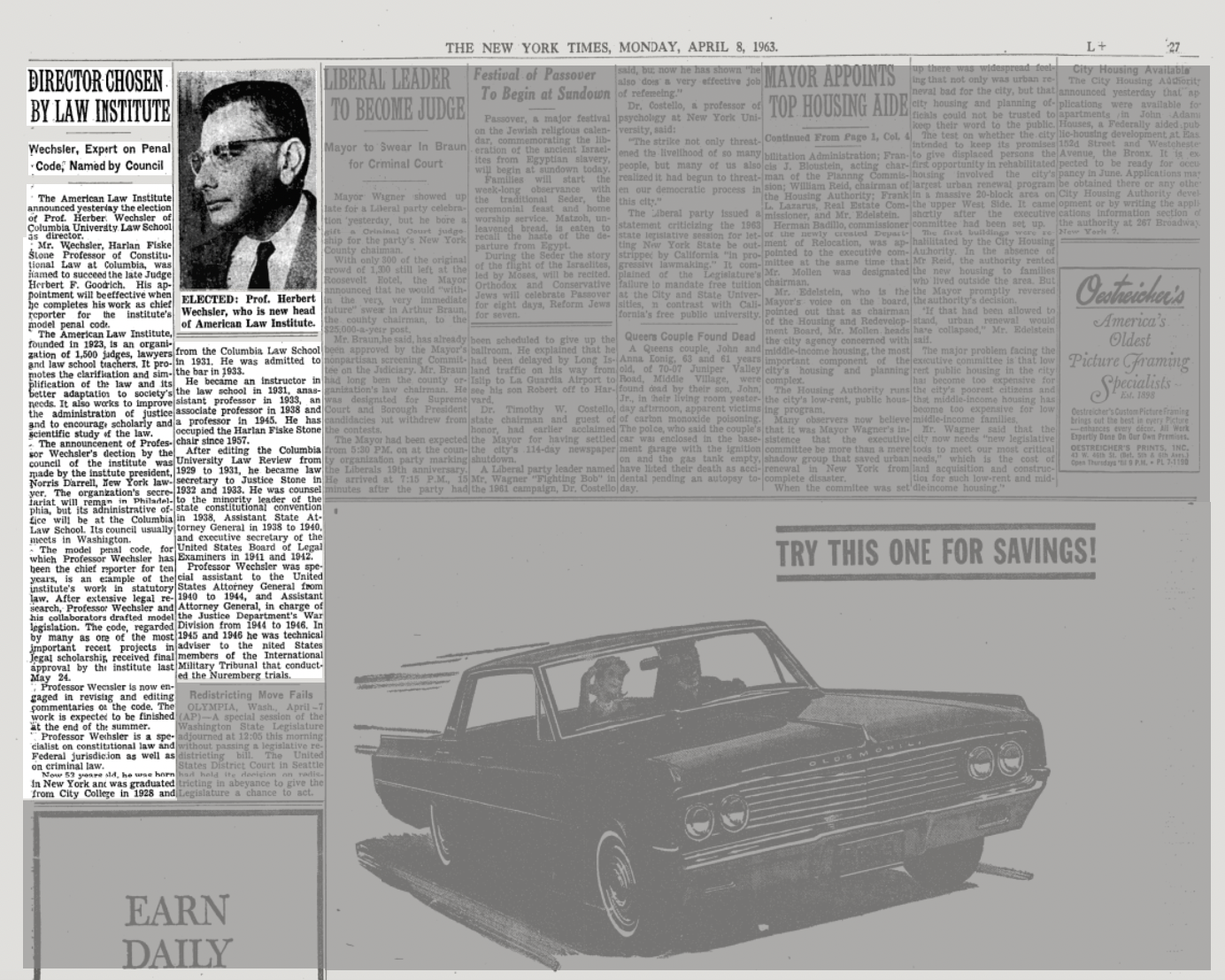 The New York Times reports on Columbia Law School Professor Herbert Wechsler’s election as director to the American Law Institute April 8, 1963. (The New York Times)