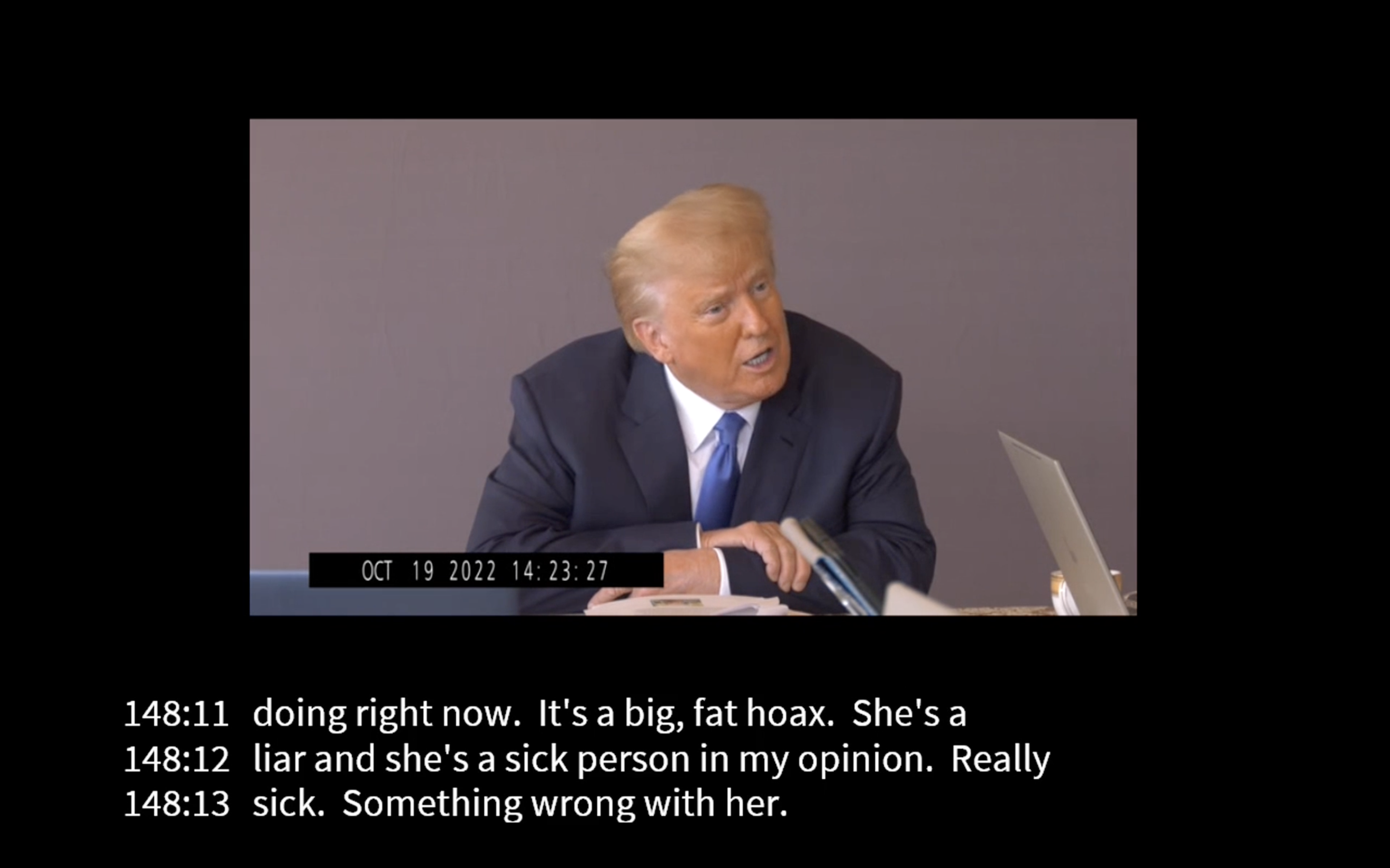 JM: It’s true that Mr. Trump’s public statements are not generally models of precision. It’s also true that he laces many of his statements with hyperbole and exaggeration and other inflammatory claims. But the statements that he made with Ms. Carroll, were riddled with very specific and obviously false and defamatory, factual allegations about her. Mr. Trump never really denied that his statements had all of the false and defamatory implications that we said they did. To the contrary, in his deposition, he was immediately ready to agree that they did. And he asserted that he stood by each and every one of them. And there is no Donald Trump exception to the principle that people can be held accountable for the things they say.
